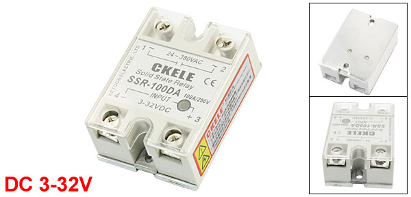 Details24-380V 100A Single Phase DC Control AC Solid State Relay SSR-100DA  Product Name Solid State Relay Type SSR-100DA Input DC 3-32V Output AC 24-380V 100A Relay Size 6.3 x 4.4 x 2.5cm/ 2.5" x 1.8" x 1"(L*W*T) Material Metal, Plastic, Electric Parts Main Color Silver Tone, Black, Clear Weight 120g Package Content 1 x Solid State Relay