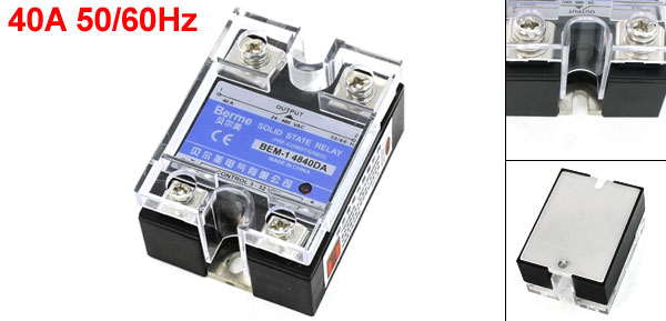 Product Name Solid State Relay Model No. BEM-14840DA Current & Frequency 40A, 50/60Hz Output Voltage 24-480VAC Control Voltage 3-32VDC Mounting Hole Diameter 4.5mm / 0.18" Total Size (Approx.) 58 x 45 x 32mm / 2.3" x 1.8" x 1.26" (L*W*T) Material Metal, Plastic, Electronic Parts Net Weight 116g Package Content 1 x Solid State Relay - Reviews
