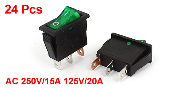 24 Pcs KCD-104 SPST ON-OFF Green Light Rocker Switch AC 250V/15A 125V/20A