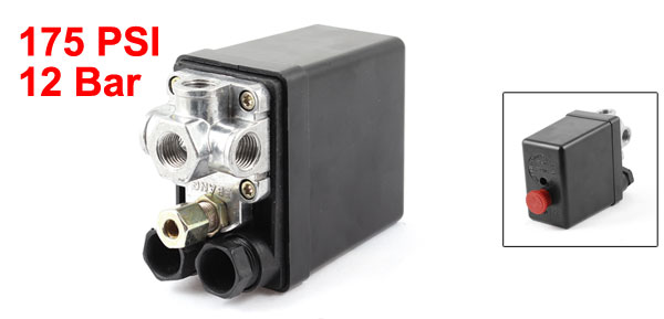 Product Name Air Compressor Pressure Switch Type 4 Ports Max. Voltage 240V Current 15A Pressure 175 PSI, 12 Bar Joint Thread Hole Dia.(Each) 1/4PT Hole Dia.(Black) 14.6mm/ 0.57" Hex Head Hole (Brass Tone) 6mm/0.24" Total Size 12.5 x 8 x 5cm/ 4.9" x 3.1" x 2" (L*W*T) Button Diameter 2cm/ 0.8" Material Metal, Plastic Main Color Black, Red Weight 320g Package Content 1 x Air Compressor Pressure Switch - Reviews