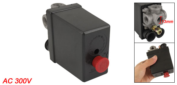 Product Name Air Compressor Pressure Switch Type 4 Ports, Normally Closed(NC) Max. Voltage AC 300V Current 20A Pressure 175PSI, 12 Bar Joint Thread Hole Dia.(Each) 1/4" (NPT) Inlet Hole Dia.(Each) 13mm/ 0.51" Inlet Thread Dia. 6mm/ 0.23" Total Size 12.5 x 8 x 5cm/ 4.9" x 3.1" x 2" (L*W*T) Button Diameter 2cm/ 0.8" Material Metal, Plastic Main Color Black, Red Weight 307g Package Content 1 x Air Compressor Pressure Switch - Reviews