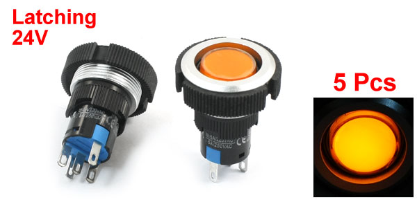 Item Name Push Button Switch Action Type Latching Type Contact SPDT(1NO 1NC) Ith 5A Rating AC 220V 5A Light Color Orange Light Voltage 24V Light Dia 15mm/0.6" Pin Number 5 Thread Diameter 22mm/0.87" Button Dia 15mm/0.6" Total Size(Not Included Pin) 29 x 32mm/1.2" x 1.3" (L*Max.W) Material Plastic, Electric Parts Housing Color Black, Orange Net Weight 57g Package Content 5 Pcs x Push Button Switch - Reviews