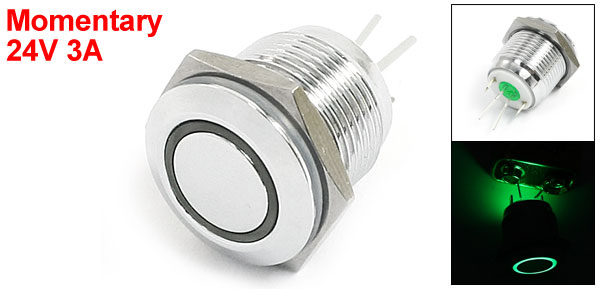 Product Name Push Button Switch Contact Type SPST Rating Voltage 24V 3A Actuator Type Momentary Position 1NO Light Color Green Pin Number 4 Thread Dia 16mm / 0.63" Button Dia 10mm / 0.4" Overall Size(Not Included Pin ) 19 x 19 x 22mm /0.75" x 0.75" x 0.83" (L*W*H) Material Metal Color Silver Tone Weight 17g Package Content 1 x Push Button Switch - Reviews