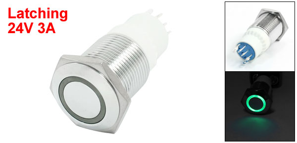 24V 3A SPDT 1NO 1NC Latching Flat Head Push Button Switch w Green Pilot Lamp