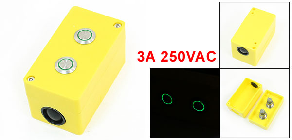 Product Name Push Button Station Action Type Momentary and Latching Round Flat Button Contact Type SPDT 1NC 1NO Working Voltage & Current 3A 250VAC Max. Withstand Current 16A Light Voltage 24V Light Color Green Button Dia 1.8cm/0.7" Overall Size 9 x 5 x 5cm/3.5" x 2" x 2"(L*W*H) Wire Hole Dia 20mm/0.78" Mounting Hole Dia 4mm/0.16" Mount Hole Distance 60mm x 35mm/2.4" x 1.4"(L*W) Material Plastic, Metal Color Green, Yellow, Silver Tone Net Weight 72g Package Content 1 x Push Button Station - Reviews
