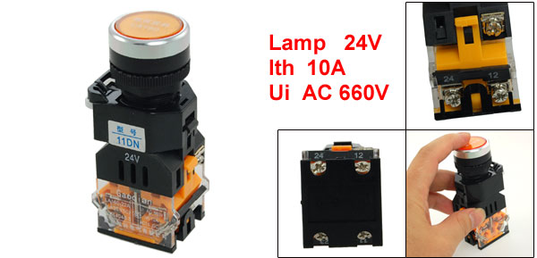 Product Name Push Button Switch Model No. LA160-22A3-11DN Contact Type 1 NO(Normally Open) + 1 NC(Normally Close) Action Type Momentary Ith 10A Ui AC 660V Lamp Voltage 24V Button Diameter 2.4cm / 0.94" Mount Hole Diameter 2.2cm / 0.87"(7/8") Fit Panel Thickness(Adjustable) Max 0.5cm / 0.2" Total Size 3.6 x 2.9 x 8.5cm / 1.4'' x 1.1'' x 3.3'' (L*W*H) Main Material Plastic, Metal Main Color Push Button: Orange Body: Black, Orange, White Weight 66g Package Content 1 x Push Button Switch - Reviews