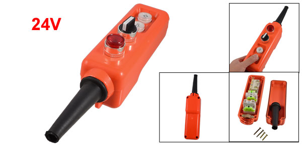 Product Name Hoist Pushbutton Switch Model No. COB COJ2123 Push Buttons Latching Red Lamp,Momentary Up and Down Selector Switch Position Type 3 Position(ON-OFF-ON) UI 660V ITH 10A Lamp Voltage 24V Main Body Size 30 x 6 x 8.5cm / 11.8" x 2.4" x 2.4"(L*W*H) Insulating Tube Length 9.8cm / 3.9" Fit Cable Diameter 1.2cm / 0.5" External Material Plastic, Rubber Color Orangere, Black, Red, White