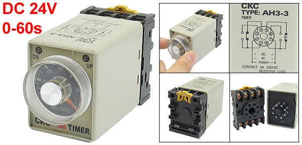 Product Name Time Relay w Base Type AH3-3 Coil Voltage 24V DC Contact Type DPDT Contact 5A 250VAC Resistive Load Time Range 0-60 Seconds