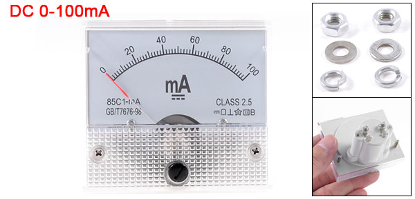 Product Name Analog Ammeter Model No. 85C1-mA Measuring Current Range DC 0-100mA Accuracy Class 2.5 Meter Face Size(Approx.) 6.4 x 5.6 x 1.1cm / 2.5" x 2.2" x 0.43"(L*W*T) Thread Size 0.3 x 0.9cm / 0.12" x 0.35"(D * L)