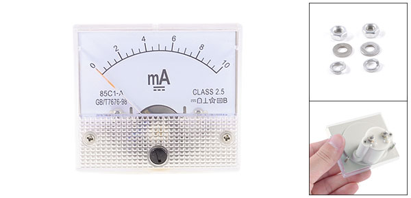 Product Name Analog Ammeter Model No. 85C1-A Measuring Current Range DC 0-10mA Accuracy Class 2.5 Meter Face Size(Approx.) 6.4 x 5.6 x 1.1cm / 2.5" x 2.2" x 0.43"(L*W*T) Thread Size 0.3 x 0.9cm / 0.12" x 0.35"(D * L)