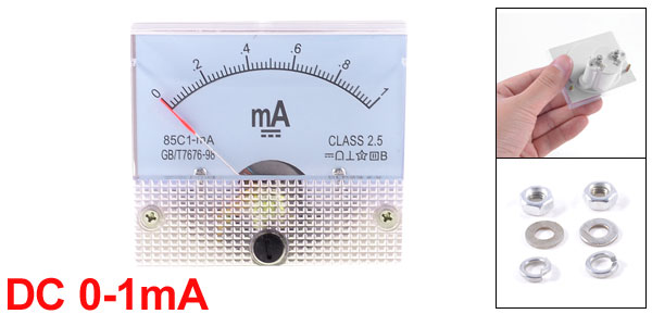 Product Name Analog Ammeter Model No. 85C1-mA Measuring Current Range DC 0-1mA Accuracy Class 2.5 Meter Face Size(Approx.) 6.4 x 5.6 x 1.1cm / 2.5" x 2.2" x 0.43"(L*W*T) Thread Size 0.3 x 0.9cm / 0.12" x 0.35"(D * L)