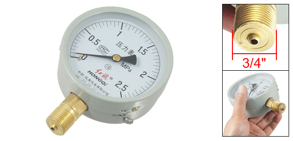 Product Name Pressure Gauge Pressure Intensity 0 -2.5Mpa Accuracy Class 1.6 (+/-1.6% fsd) Connector Type 3/4"(1.9cm) Threaded Male NPT Size 9.7 x 4.5cm/ 3.8" x 1.8" (D*T) Dial Color White Exterior Material Metal Net Weight 367g Package 1 x Pressure Gauge - Reviews