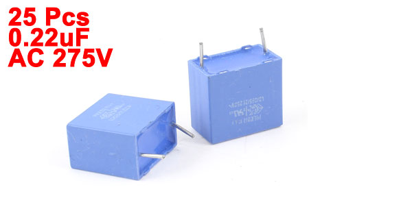 Product Name Polypropylene Film Safety Capacitors Main Color Maya Blue, Silver Tone Rated Voltage AC 275V Series X2 Capacitance 0.22uF Capacitance Tolerance K(±10%) Lead Spacing 1.5cm / 0.6" Lead Diameter 0.7mm / 0.027" Total Size(Exclude Lead) 1.7 x 1.5 x 1.0cm / 0.7" x 0.6" x 0.4"(L*W*T) Weight 86g Package Content 25 Pcs x Safety Polypropylene Film Capacitors - Reviews