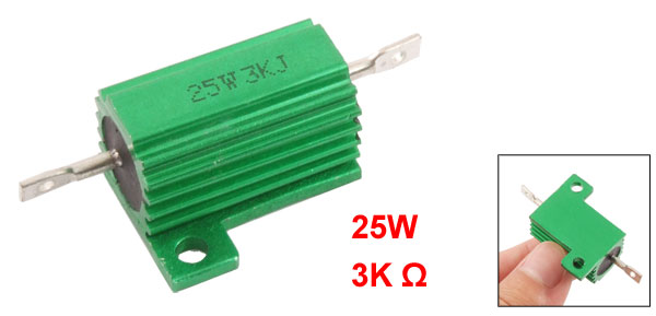 Product Name Aluminum Resistor Resistance Value 3K Ω Power Rating 25W Resistance Tolerance ± 5% (J) Body Size 26 x 15mm/1" x 0.6" (L*D) Mounted Hole Size 1.8mm/ 0.07", 3.3mm/ 0.13" Total Size 50 x 27 x 15mm/2" x 1.1" x 0.6" (L*W*T) Casing Material Aluminum Color Green Weight 13g Package Content 1 x Aluminum Resistor - Reviews