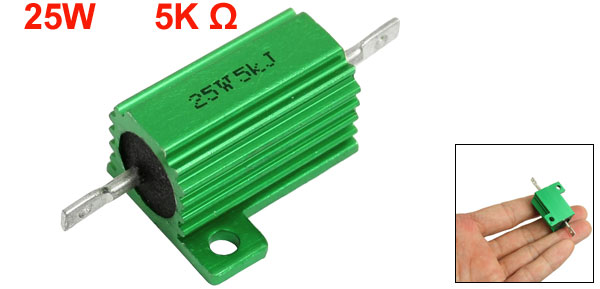Product Name Aluminum Resistor Resistance Value 5K Ω Power Rating 25W Resistance Tolerance ± 5% (J) Body Size 26 x 15mm/1" x 0.6" (L*D) Mounted Hole Size 1.5mm/0.06", 2.5mm/0.1" Total Size 50 x 27 x 15mm/2" x 1.1" x 0.6" (L*W*T) Casing Material Aluminum Color Green Weight 13g Package Content 1 x Aluminum Resistor - Reviews