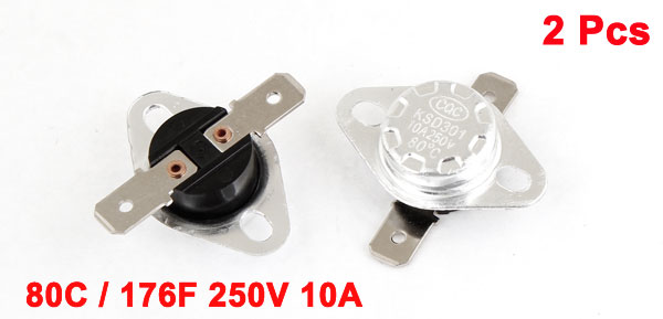 Product Name Temperature Switch Thermostat Model No. KSD301 Action Type Normal Close Action Temperature 80C / 176F Voltage 250V 10A Size (Each) 3.4 x 1.2cm / 1.3" x 0.47" (L*H) Mounting Hole Spacing 1.8cm / 0.7" Material Metal, Plastic Color Black, Silver Tone Net Weight 8g Package Content 2 x Temperature Switch Thermostat - Reviews