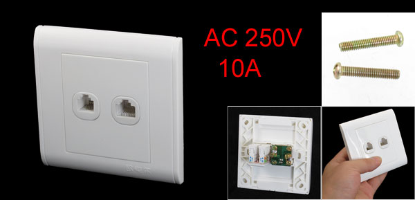 Product Name Wall Plate Outlet Type RJ11 Telephone, RJ45 ComputerSocket Material Plastic, Electronic Parts Color White Size 8.6 x 8.6 x 0.8cm/3.4'' x 3.4'' x 0.3'' (L*W*T) Installing Hole Diameter 3.7mm/0.14" Power AC 250V, 10A Weight 54g Package Content 1 x Telephone Computer Wall Plate Face Socket