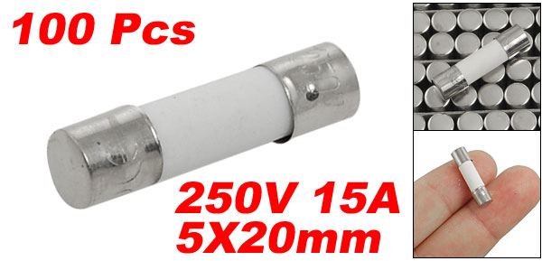 Product Name Ceramic Fuse Fuse Type Fast Acting Features Low Breaking Capacity Rated Voltage 250V Rated Current 15A Specification 5 x 20mm Diameter 5mm / 0.196" Length 20mm / 0.787" Quantity 100(±2%) Material Ceramic Main Color White, Silver Tone Net Weight 86g Package Content 100 x Ceramic Fuses - Reviews