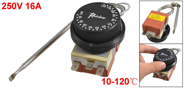 Product Name Temperature Control Switch Control Temperature 10-120Celsius Main Material Plastic,Metal Power 250V 16A Contact ENC, ENO Connect Method 3 pin connect to power electrical circuit Main Color Black, Silver Tone Contact Stick Length 10.5cm/ 4.1" Contact Stick Diameter 5mm / 0.2" Total Size 13.9 x 5.2cm / 5.9" x 2"(L*W) Weight 99g Package Content 1 x Temperature Control Switch - Reviews