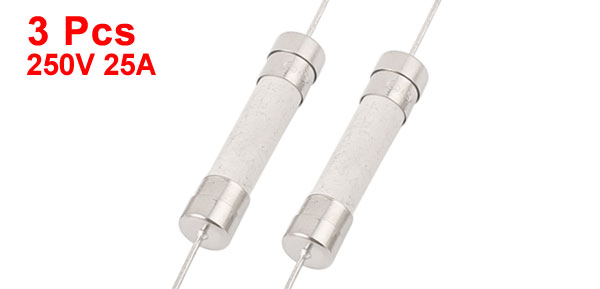 Product Name Ceramic Fuse Rated Power 250V, 25A Body Size 30 x 6mm/ 1.2" x 0.24" (L*D) Wire Leads Length(Each) 30mm/ 1.2" Total Size 90 x 6mm/3.5" x 0.24"(L*D) Function Fast Blow Color White, Silver Tone Material Ceramic, Alloy Weight 10g Package 3 Pcs x Ceramic Fuse - Reviews