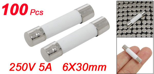 Product Name Ceramic Fuse Fuse Type Fast Acting Features Low Breaking Capacity Rated Voltage 250V Rated Current 5A Specification 6 x 30mm Diameter 6mm / 0.236" Length 30mm / 1.181" Quantity 100(±2%) Material Ceramic Main Color White, Silver Tone Net Weight 166g Package Content 100 x Ceramic Fuses - Reviews