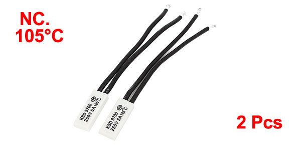 Details250V 5A NC. 105C Bimetal Thermostat Temperature Sensor Control Switch 2 Pcs  Product Name Temperature Control Switch Model.No KSD9700 Contact Type NC. Rated Power 250V 5A Active Temperature 105C Lead Wire Length 7.3cm / 2.9" Head Dimension 20 x 7.5 x 3.5mm/0.78" x 0.3" x 0.14"(L*W*H) Material Bimetal ,Plastic,Stainless Steel Main Color White,Black Net Weight 7g Package Content 2PCS x Temperature Control Switch