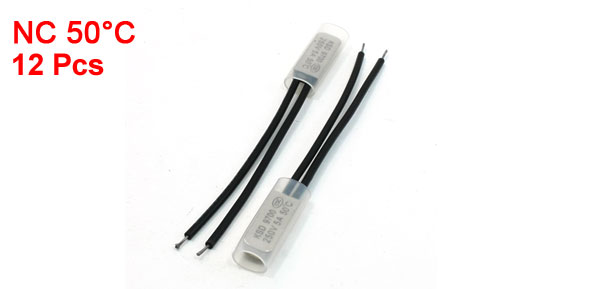 Rated Power 250V 5A Active Temperature 50°C Lead Wire Length 7.3cm / 2.9" Head Dimension 20 x 7.5 x 3.5mm/0.78" x 0.3" x 0.14"(L*W*T) Material Bimetal ,Plastic,Stainless Steel Main Color Silver Tone, Black Net Weight 40g Package Content 12PCS x Temperature Control Switch - Reviews