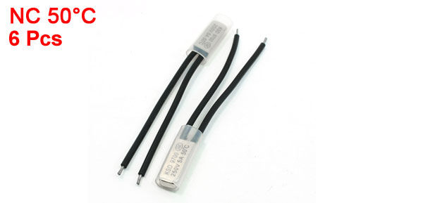 Rated Power 250V 5A Active Temperature 50°C Lead Wire Length 7.3cm / 2.9" Head Dimension 20 x 7.5 x 3.5mm/0.78" x 0.3" x 0.14"(L*W*T) Material Bimetal ,Plastic,Stainless Steel Main Color Silver Tone, Black Net Weight 24g Package Content 6PCS x Temperature Control Switch - Reviews