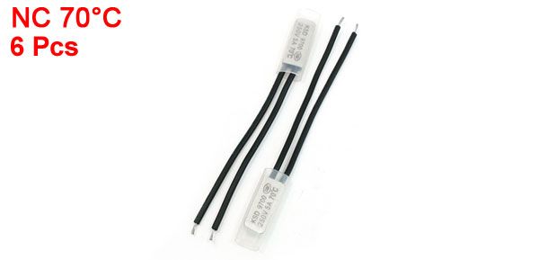 Rated Power 250V 5A Active Temperature 70°C Lead Wire Length 7.3cm / 2.9" Head Dimension 20 x 7.5 x 3.5mm/0.78" x 0.3" x 0.14"(L*W*T) Material Bimetal ,Plastic,Stainless Steel Main Color Silver Tone, Black Net Weight 20g Package Content 6 PCS x Temperature Control Switch - Reviews