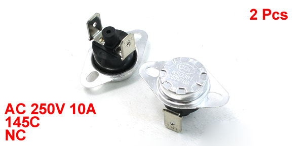 Product Name Plastic Thermostat Model.No KSD301 Action Type NC Action Temperature 145C Voltage 10A AC 250V Size(Each) 3.3 x 1.9 x 2cm/1.3" x 0.75" x 0.78"(L*T) Material Metal, Plastic Color Black, Silver Tone Net Weight 15g Package Content 2 x Plasitc Thermostat - Reviews
