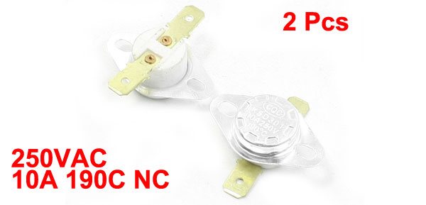 Details250VAC/10A 190C NC Ceramic Temperature Controller Thermostat KSD301 2 Pcs  Product Name Ceramic Thermostat Model.No KSD301 Action Type NC Action Temperature 190C Voltage 10A AC 250V Size(Each) 3.3 x 3.3 x 1.3cm/1.3" x 1.3" x 0.51"(L*T) Material Metal, Ceramic Color White, Gold Tone, Silver Tone Net Weight 15g Package Content 2 x Ceramic Thermostat