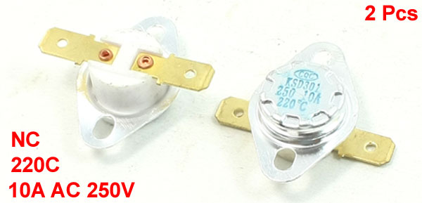 Product Name Ceramic Thermostat Model.No KSD301 Action Type NC Action Temperature 220C Voltage 10A AC 250V Size(Each) 3.3 x 3.3 x 1.3cm/1.3" x 1.3" x 0.51"(L*T) Material Metal, Ceramic Color White, Gold Tone, Silver Tone Net Weight 15g Package Content 2 x Ceramic Thermostat - Reviews