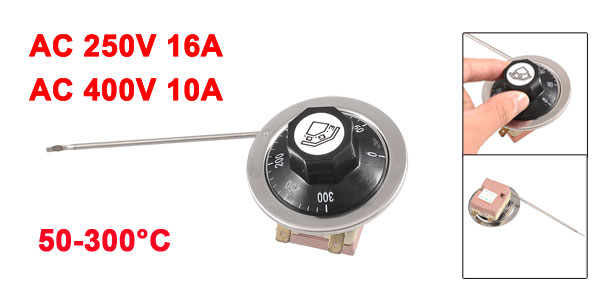 Product Name Temperature Control Capillary Thermostat Model.No VGB300-112-3222 Rating AC 250V 16A AC 400V 10A Temperature 50-300C Cable Length 60cm/ 23.6" Sensing Rod Size 140 x 3mm/ 5.5" x 0.12"(L*Dia) Panel Diameter 68mm/ 2.68" Body Size 53 x 35 x 23mm/ 2.1" x 1.4" x 0.9"(L*W*H) Total Size 68 x 68 x 52mm/ 3.62" x 3.62" x 2"(L*W*H) Material Ceramic, Metal, Plastic Color Blue, Black Net Weight 93g Package Content 1 x Temperature Control Capillary Thermostat - Reviews