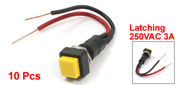 250VAC 3A Yellow Square Head Latching SPST Push Button Switch 10Pcs