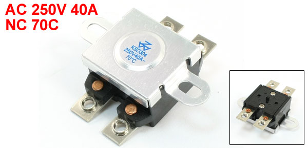 Product Name Temperature Control Switch Thermostat Model.No KSD304 Action Type NC Action Temperature 70C Voltage 40A AC 250V Size(Each) 5 x 4.8 x 1.8cm/2" x 1.9" x 0.7"(L*W*T) Material Metal, Plastic Color Black, Silver Tone Net Weight 21g Package Content 1 x Temperature Control Switch Thermostat - Reviews