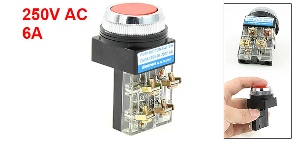 Product Name Push Button Switch Contact Type 1NO, 1NC Working Voltage & Electricity AC 250V, 6A Max Voltage 600V Terminal Quantity 4 Panel Cutout Diameter 29mm / 1.14" Fit Panel Max. Thickness 6mm / 0.24" Total Size(Approx) 6.5 x 3.5 x 3.5cm / 2.56" x 1.4" x 1.4" (L*W*H) External Material Plastic, Electric Parts Color Black, Red Net Weight 46g Package Content 1 x Push Button Switch - Reviews