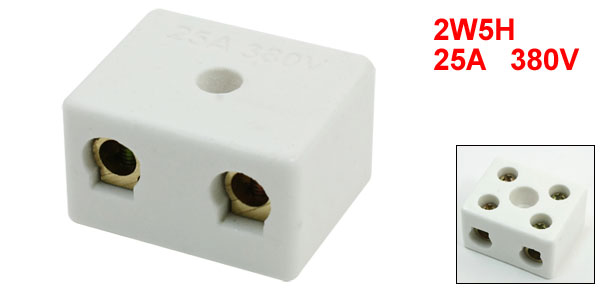Product Name Ceramic Terminal Block Type 2W5H Rating Current 25A Rating Voltage 380V Max. Withstand Temperature 500°C Total Size 3.8 x 3.1 x 2.3cm/1.5" x 1.2" x 0.9"(L*W*T) Screw Mounting Hole Dia 7mm/0.28" Materials Ceramic, Bronze Main Color White Net Weight 89g Package Content 1 x Ceramic Terminal Block - Reviews