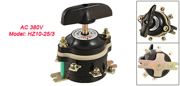 Product Name Change Over Switch Model No. HZ10-25/3 Pitch Number 3 Rated Insulation Voltage (Ui) 380V Rated Operation Voltage (Ue) AC 380V (AC-22A) DC 220V (DC-21A) Rated Operation Current (Ie) 25A (AC-22A, DC-21A) Base Mounting Distance 86mm/ 3.4" Total Size 100 x 93 x 108mm/ 3.9" x 3.7" x 4.3" (L*W*H) Net Weight 345g Material Plastic & Metal Main Color Black Package Content 1 x Change Over Switch - Reviews