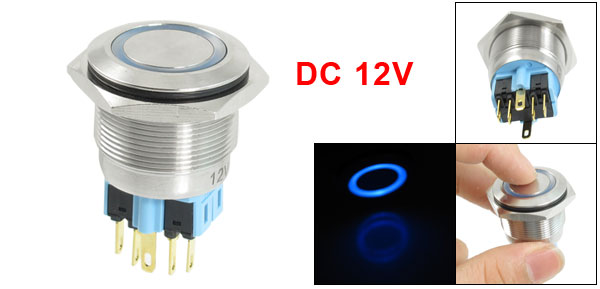 Item Name Push Button Switch Action Type Latching Type LED Type Ring-Illuminated LED Head Shape Flat Head Contact DPDT(1NO 1NC ) Switch Rating 250VAC 5A Lamp Voltage DC 12V LED Color Blue Pin Number 6 Thread Diameter 25mm/1'' Total Size(Pin No Include) 32 x 35mm/1.3'' x 1.4'' (L*Max.W) Material Stainless Steel, Plastic, Electric Parts Housing Color Silver Tone, Blue, Black Weight 41g Package Content 1 x Push Button Switch - Reviews