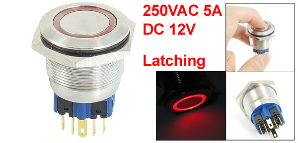 Item Name Push Button Switch Action Type Latching Type LED Type Ring-Illuminated LED Head Shape Flat Head Contact SPDT(1NO 1NC ) Switch Rating 250VAC 5A Lamp Voltage DC 12V LED Color Red Pin Number 6 Thread Diameter 25mm/1'' Total Size(Pin No Include) 32 x 35mm/1.3'' x 1.4'' (L*Max.W) Material Stainless Steel, Plastic, Electric Parts Housing Color Silver Tone, Blue, Black Weight 42g Package Content 1 x Push Button Switch - Reviews
