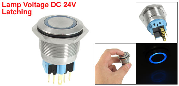 Item Name Push Button Switch Action Type Latching Type LED Type Ring-Illuminated LED Head Shape Flat Head Contact SPDT(1NO 1NC ) Switch Rating 250VAC 5A Lamp Voltage DC 24V LED Color Blue Pin Number 6 Thread Diameter 25mm/1'' Total Size(Pin No Include) 32 x 35mm/1.3'' x 1.4'' (L*Max.W) Material Stainless Steel, Plastic, Electric Parts Housing Color Silver Tone, Blue, Black Weight 40g Package Content 1 x Push Button Switch - Reviews