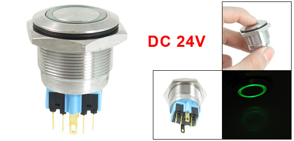 Item Name Push Button Switch Action Type Latching Type LED Type Ring-Illuminated LED Head Shape Flat Head Contact SPDT(1NO 1NC ) Switch Rating 250VAC 5A Lamp Voltage DC 24V LED Color Green Pin Number 6 Thread Diameter 25mm/1'' Total Size(Pin No Include) 32 x 35mm/1.3'' x 1.4'' (L*Max.W) Material Stainless Steel, Plastic, Electric Parts Housing Color Silver Tone, Blue, Black Weight 42g Package Content 1 x Push Button Switch - Reviews