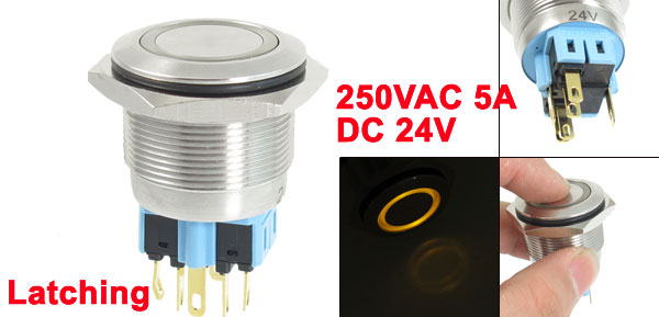 Item Name Push Button Switch Action Type Latching Type LED Type Ring-Illuminated LED Head Shape Flat Head Contact SPDT(1NO 1NC ) Switch Rating 250VAC 5A Lamp Voltage DC 24V LED Color Yellow Pin Number 6 Thread Diameter 25mm/1'' Total Size(Pin No Include) 32 x 35mm/1.3'' x 1.4'' (L*Max.W) Material Stainless Steel, Plastic, Electric Parts Housing Color Silver Tone, Blue, Black Weight 41g Package Content 1 x Push Button Switch - Reviews