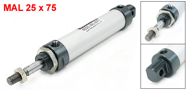Product Name Air Cylinder Model MAL25 x 75 Working Fluid Air Bore 25mm/ 0.98'' Stroke 75mm/ 2.95'' Rod Diameter 30mm/ 1.18'' Piston Rod Diameter 22mm/ 0.87'' Screw Hole Diameter 8mm/ 0.3" Threaded End Diameter 10mm/ 0.4" Overall Size 210 x 33mm/ 8.3'' x 1.3''(L*Max. W) Material Aluminum Alloy Color Silver Tone Weight 295g Package Content 1 x Air Cylinder - Reviews