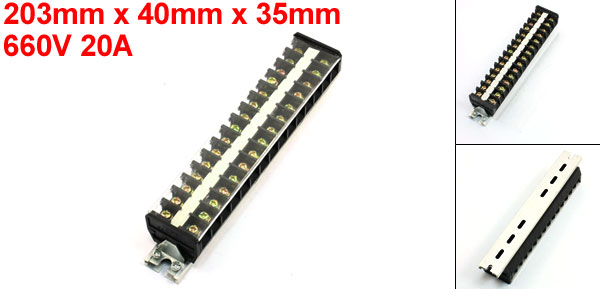 Product Name Barrier Terminal Strip Model TD-2015 Rating 660V 20A Poles 15 Position, Dual Row Each Screw Terminal Width 8mm/0.32" DIN Rail Type 25mm DIN Rail Size 203 x 40 x 35mm / 10.2" x 1.6" x 1.4"(L*W*H) Material Aluminum, Metal, Plastic Color Black, Clear Net Weight 174g Package Content 1 x Barrier Terminal Strip - Reviews