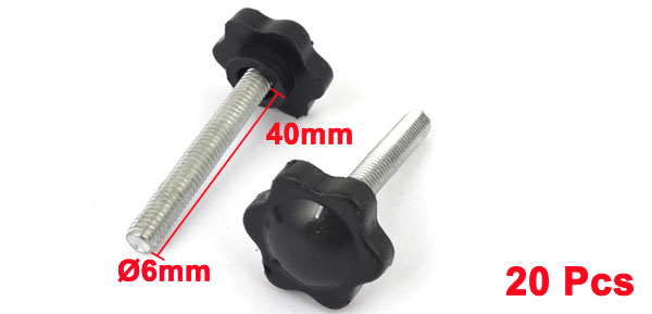 Details25mm Star Head Diameter 6mm x 40mm Clamping Screw Knob Grip 20Pcs  Product Name Clamping Screw Knob Type Screw On Head Diameter 25mm/ 1" Thread Length 40mm/ 1.6“ Thread Diameter 6mm / 0.24" Total Height 52mm/ 2" Material Metal, Plastic Color Silver Tone, Black Weight 236g Package Content 20 x Clamping Screw Knob