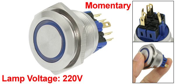Item Name Push Button Switch Contact Type Momentary(1NO 1NC) Model MP025S/F11-E Switch Rating 250VAC, 5A Lamp Voltage 220V LED Color Blue Pin Number 6 Mounting Thread Diameter 25mm / 0.98" Total Size (Approx.) 41 x 34mm / 1.6"x1.36" (L*W) Material Stainless, Electric Parts Housing Color Silver Tone Net Weight 45g Package Content 1 x Push Button Switch - Reviews