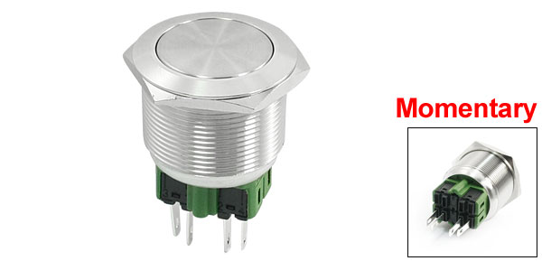 Item Name Push Button Switch Action Type Momentary LED Type Ring-Illuminated LED Head Shape Flat Head Contact SPDT(1NO 1NC ) Switch Rating 250VAC 5A Pin Number 6 Thread Diameter 25mm/1" Total Size(Pin No Include) 42 x 28mm/1.7" x 1.1" (L*Max.W) Material Stainless Steel, Plastic, Electric Parts Housing Color Silver Tone, Green, Black Weight 35g Package Content 1 x Push Button Switch