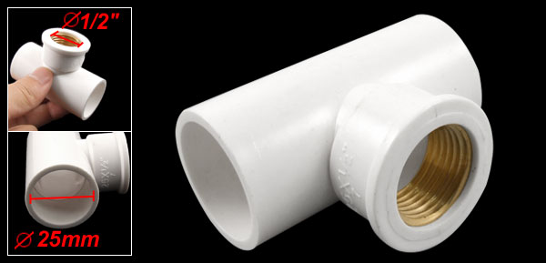 Product Name Tee Connector Design 3 Ways Ends Slip x Slip x Female Thread Slip End Dia. 25mm x 25mm Female Thread Dia. 1/2" Overall Size (Approx.) 61 x 48mm / 2.4" x 1.9" (L*W) Material PVC, Brass Color White Net Weight 33g Package Content 1 x Tee Connector - Reviews