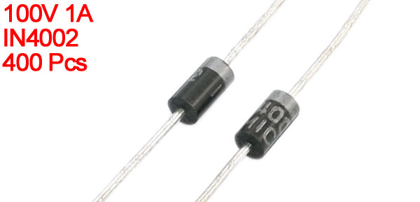 Product Name Rectifier Diode Model IN4002 Forward Current 1A Max Peak Reverse Voltage 100V Lead Size 0.7 x 27mm/ 0.01" x 1"(D*L) Body Size 2.5 x 5mm/ 0.1" x 0.2" (D*L) Main Color Black, Silver Tone Weight 95g Package Content 400 Pcs(±2%) x Rectifier Diodes - Reviews